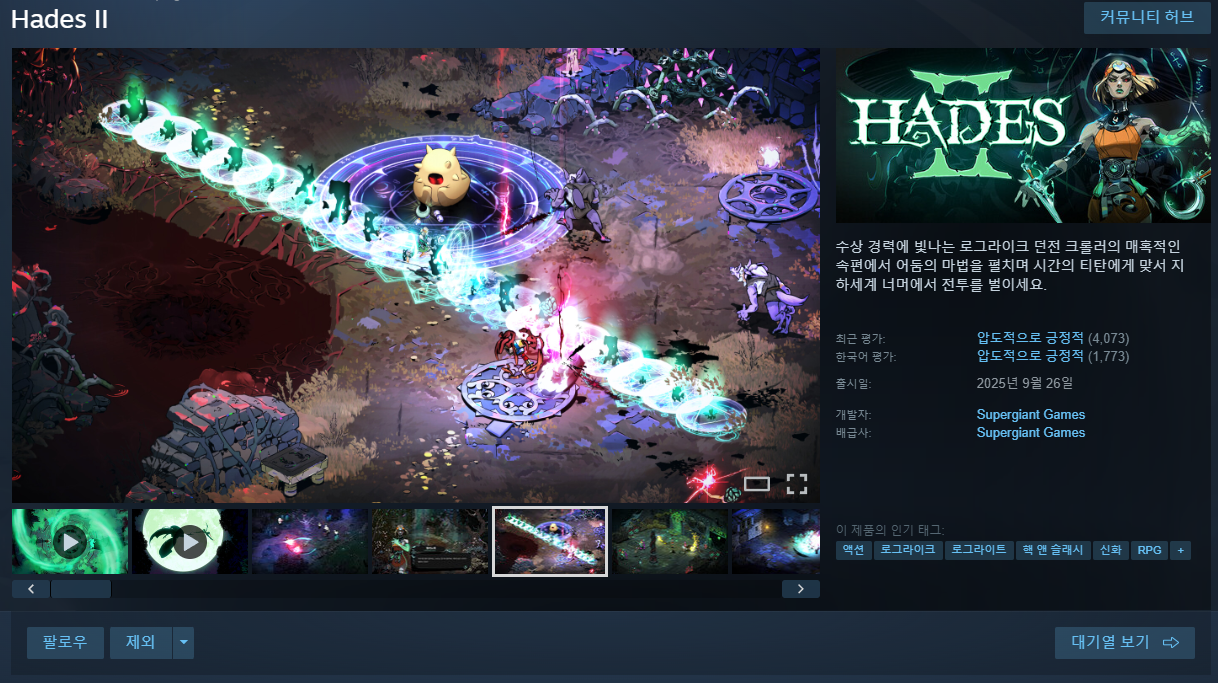 하데스2는 Supergiant Games가 개발한 로그라이크 액션 RPG로, 2025년 9월 25일 정식 버전 1.0이 출시되며 큰 주목을 받고 있는 작품입니다. 전작 Hades의 명성을 계승하면서도 스토리·전투·재플레이 요소를 한층 확장해 세계 각국의 비평가와 게이머로부터 극찬을 받고 있습니다. 하데스2는 빠른 전투 루프, 신화적 세계관, 깊이 있는 성장 시스템을 결합해 2025년 최고의 RPG 타이틀 중 하나로 자리매김했습니다.